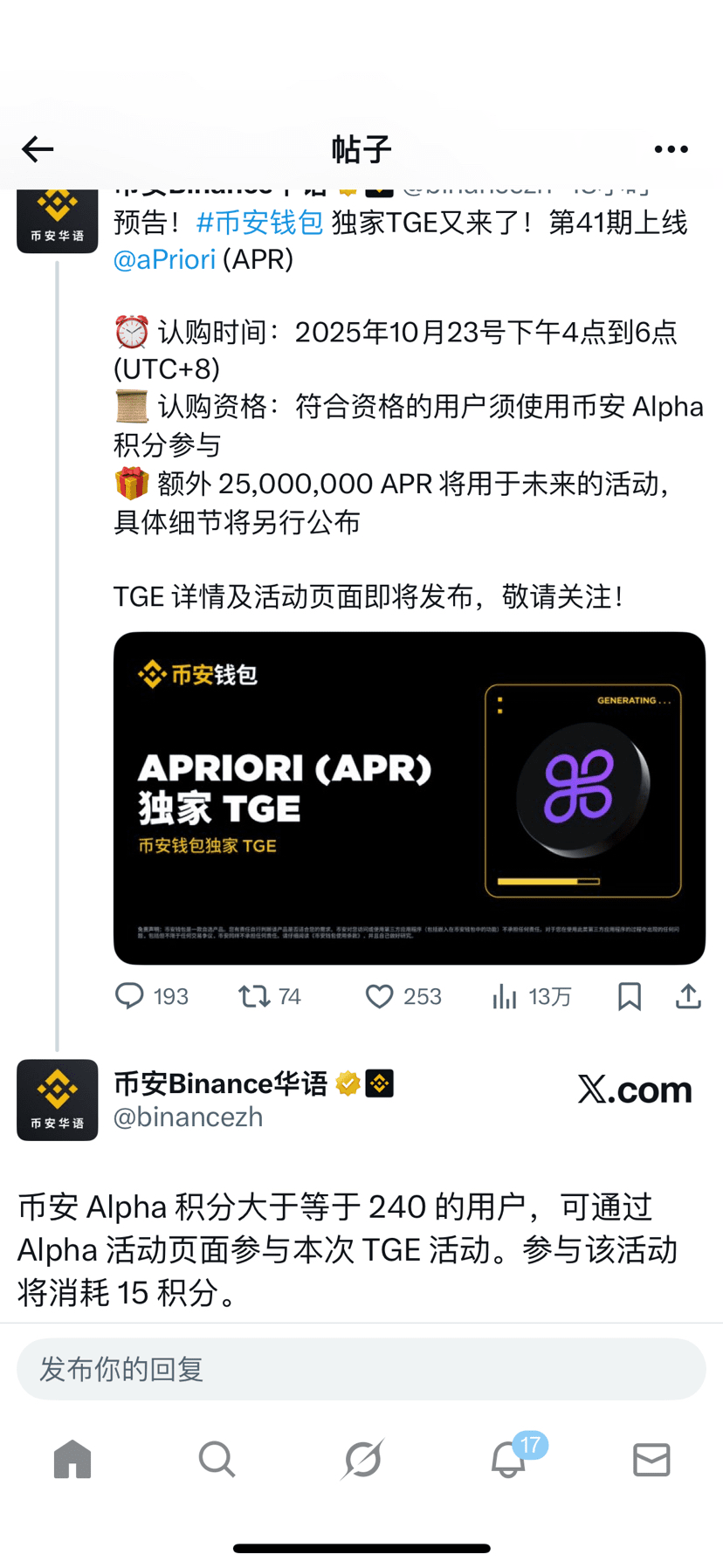 • 參與路徑:幣安APP→Alpha專區→aPriori TGE活動入口