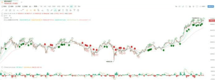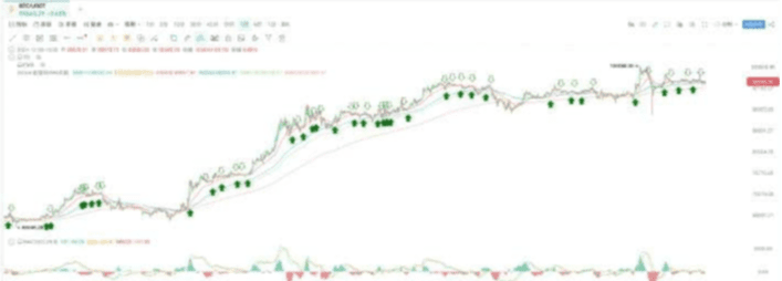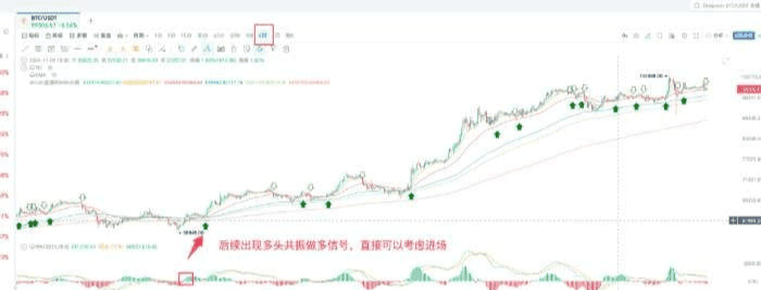 我這裏有一套 EMA 共振算法,它的優點是信號多、入場準、出場快。綠色實心箭頭代表多頭共振開始,空心箭頭代表多頭共振結束。如果市場趨勢是向上的,結合這些信號,我們就可以果斷進場。在下跌趨勢中,也會有相應的做空信號出現。
