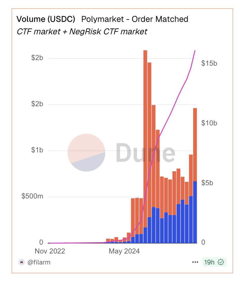 🖇️ 您看到的圖表來自 Dune Analytics,這是投資專業人士首選的數據分析平臺。這個圖表是 Polymarket 價值數十億美元的視覺證據: