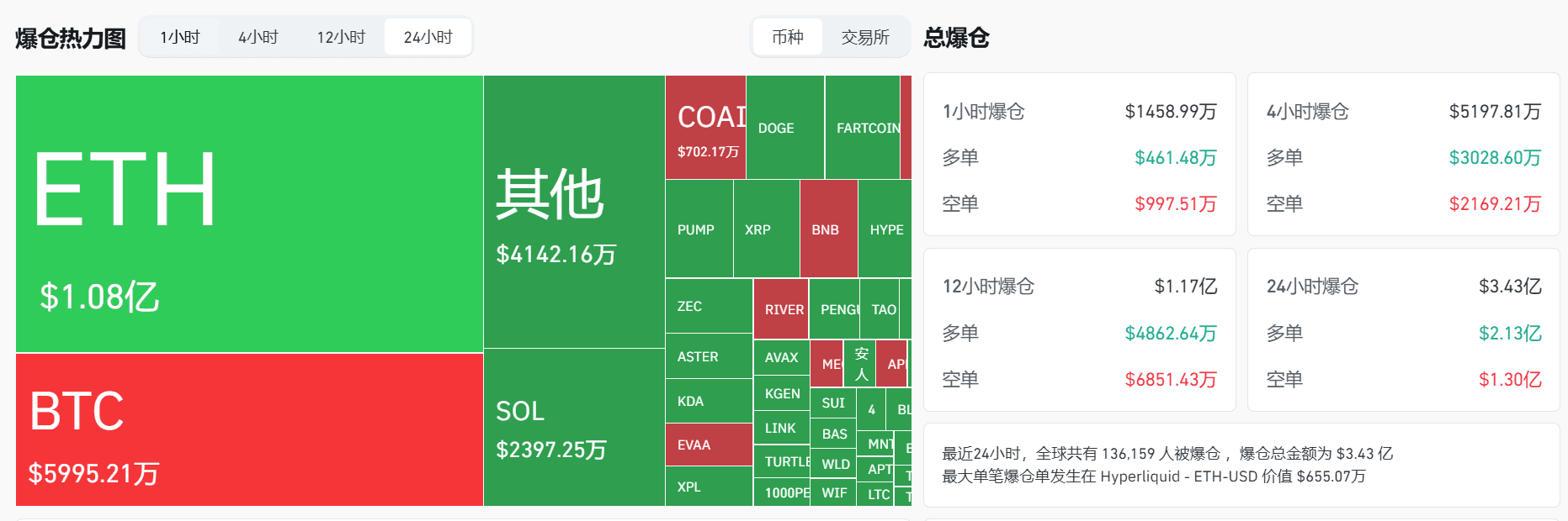 比特幣爆倉金額達 5995.21 萬美元,以太坊爆倉 1.08 億美元。過去 24 小時內共有 136,159 人被爆倉,最大單筆爆倉出現在 Hyperliquid 的 ETH-USD 交易對上,價值 655.07 萬美元。
