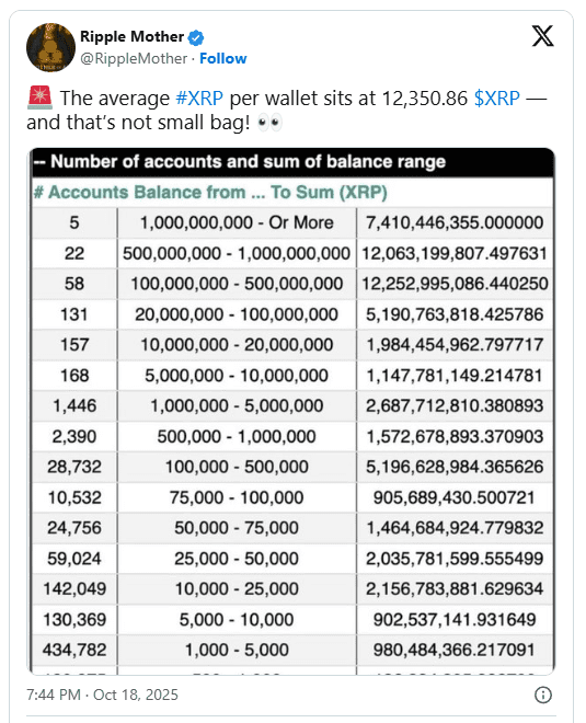 $XRP 最近關於 XRP 錢包分佈的更新突顯了每個賬戶的平均餘額為 12,350.86 XRP。乍一看,這一數字可能暗示典型持有者保持著可觀的頭寸。