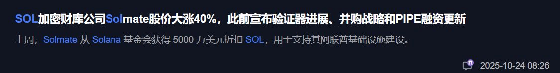 就在今天凌晨,SOL的親兒子“Solmate公司”突然爆出猛料:拿到Solana基金會5000萬美金折扣SOL!股價直接飆漲40%!這相當於打仗前突然空投彈藥,明擺着要給SOL生態續命。但注意!這種利好往往先拉盤後割韭菜,別盲目追高,小心炮彈炸自己手裏!