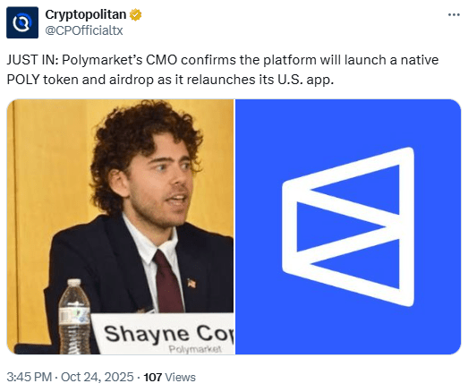 當創始人Shane Coplan暗示可能的代幣推出時,熱潮開始了——引發了Polymarket用戶之間的投機和戰略交易,希望能夠獲得空投資格。
