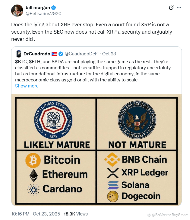 Responding to DrCuadrado’s claim, Bill Morgan, an Australian attorney well known for his precise commentary on the Ripple vs. SEC case, criticized the continued spread of false narratives about XRP. He reminded followers that a U.S. federal court had already ruled in 2023 that XRP itself is not a security, a landmark decision that reshaped its legal and market perception.