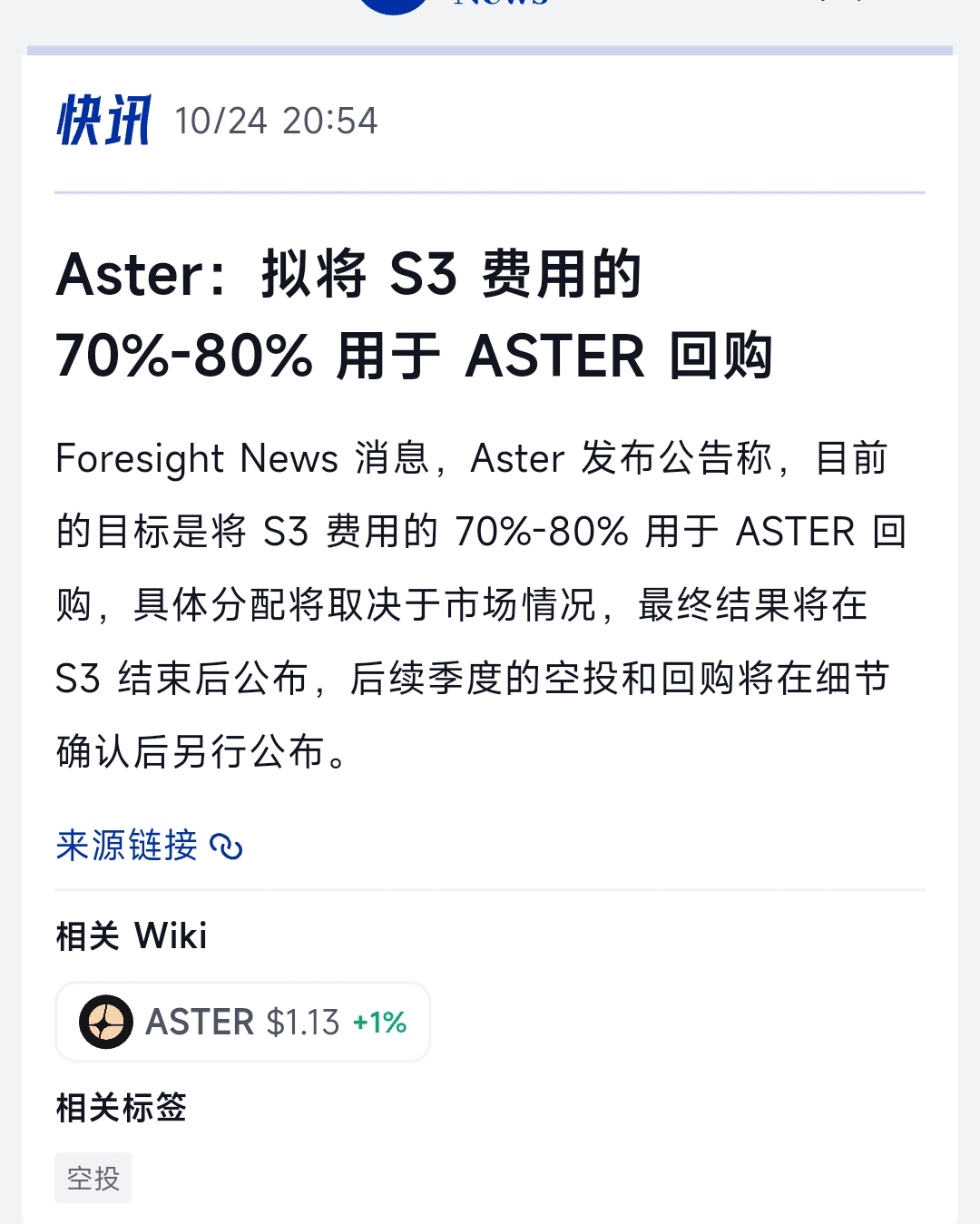 $ASTER 項目方決定將再次回購,這次的資金將達到協議費用的70-80%。自10月11日大暴跌以來#aster回购 就進入了疲軟走勢一直逐步走低,市場熱度也在不斷消退,此時提出回購計劃無異於給市場打了一支強心劑。