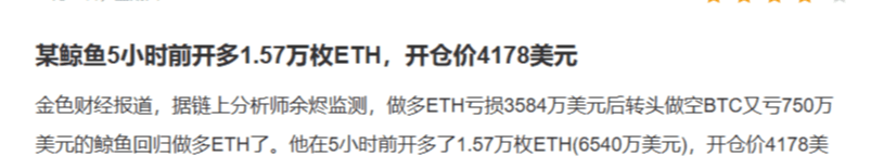情緒面:鯨魚豪擲 1.57 萬枚 ETH(6,540 萬美元)開多,開倉價 4178 美元,清算價 4078 美元,看似和散戶站在同一陣線。