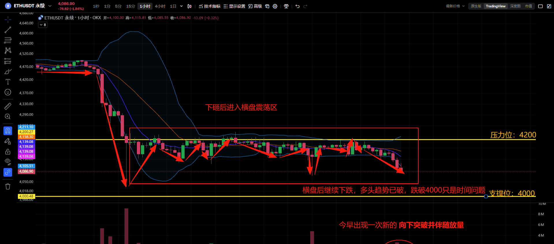 一句大白話總結:利好再多,不如一根下跌K線真實。ETH 今天的走勢證明了一個殘酷事實——市場面前,沒有神仙,鯨魚和散戶一樣都可能被爆倉。短期看,ETH 大概率跌破 4000 美元,空頭佔優纔是核心邏輯。我的觀點很明確:守不住 4000,就別猶豫,該減倉減倉,該順勢空就空,別幻想行情會給你留情面。