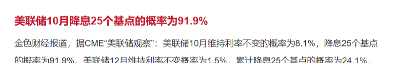 宏觀面:美聯儲 10 月降息 25 個基點概率高達 91.9%,年底前累計降息 50 個基點概率 74.4%,按理說資金面寬鬆,對幣市利好。