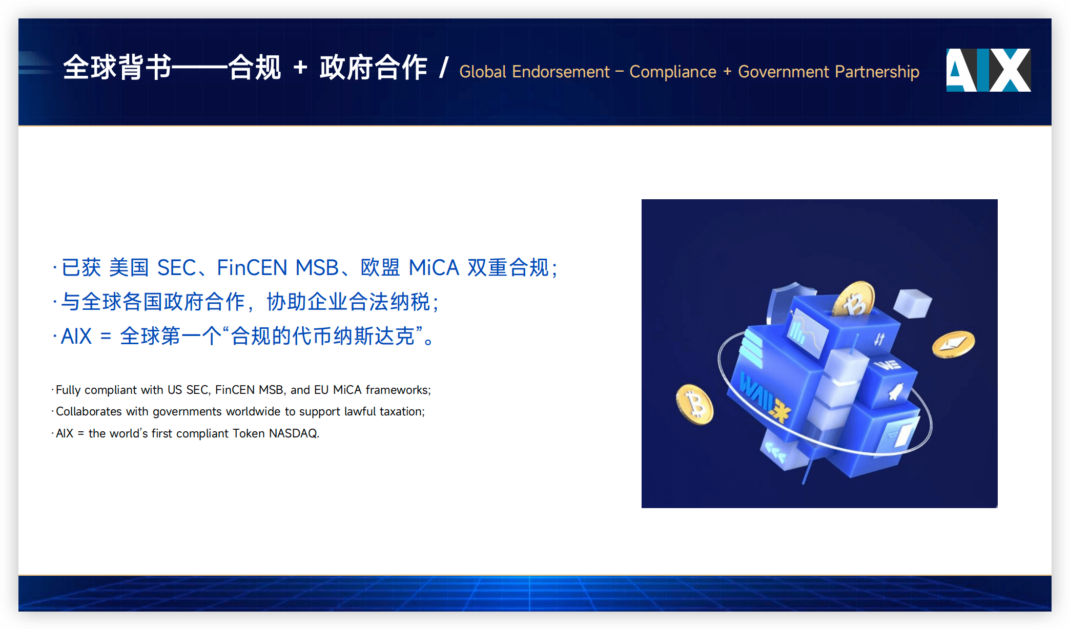 AIX已獲美國MSB與歐盟MiCA雙牌照,並同步推進香港與新加坡的監管備案。