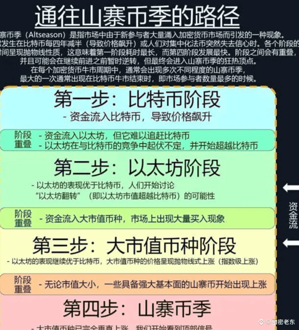 币圈山寨牛市必然会到,一张图告诉你:通往币圈山寨币季的路径,总共分为四个阶段,真正赚大钱的时候还得是牛市! 作为在币圈炒币10余年的我来说,经历了三次牛熊,真正在币圈赚大钱的时候,还得是牛市!