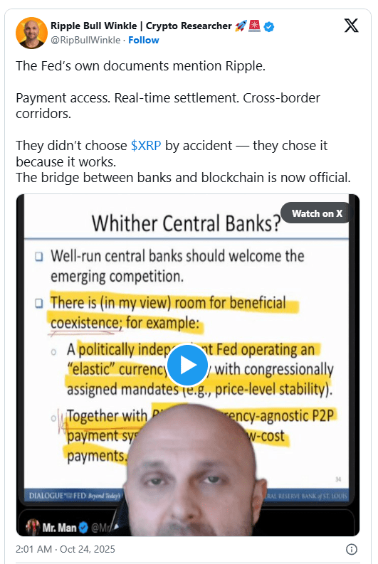 Ripple Bull Winkle,XRP社區中一個知名的聲音,在X上分享了一段視頻剪輯,聲稱美聯儲確認了Ripple被納入其內部文件,引起了廣泛關注。“大家做好準備,這是真的,”他說。