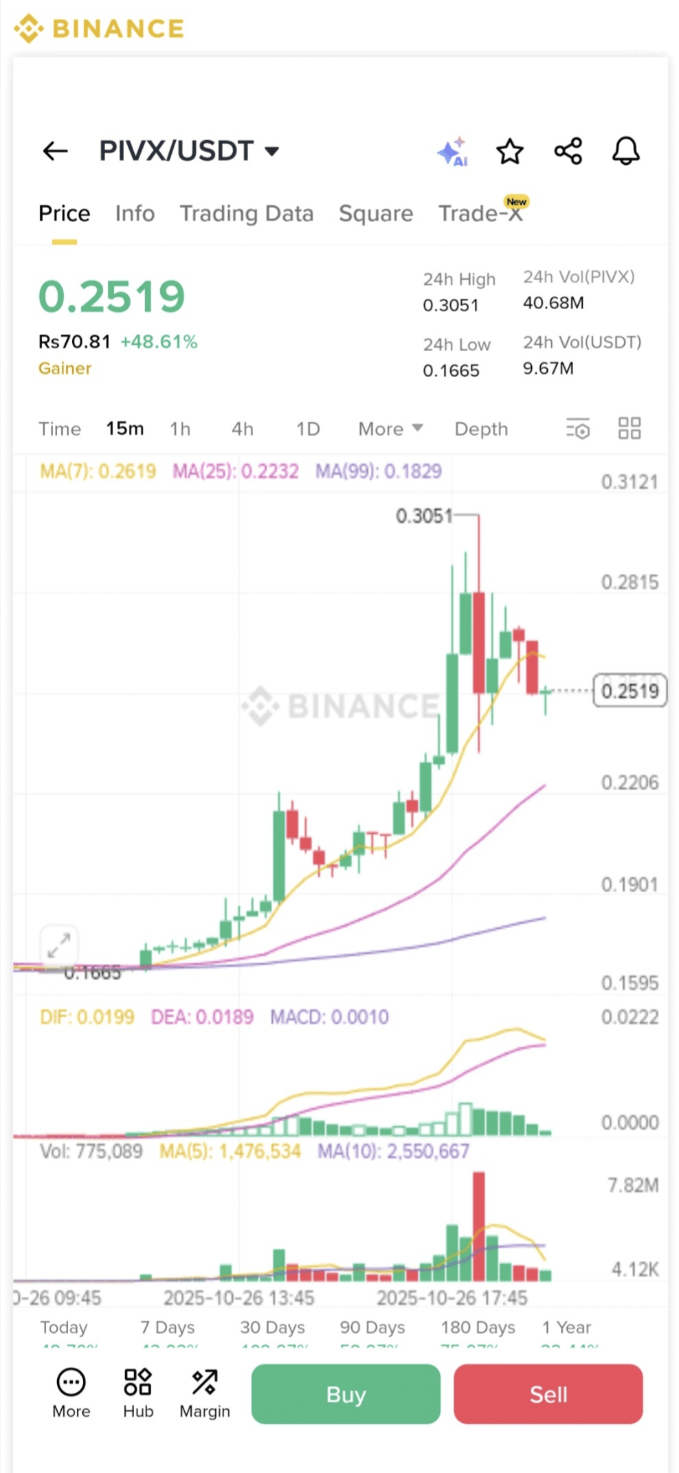 看看15分鐘的時間框架:PIVX從$0.1665反彈到最高$0.3051,幾乎在日內翻倍,然後輕微回調至$0.25範圍。這種回調是健康的,這是重置指標並震出弱手的冷卻類型。