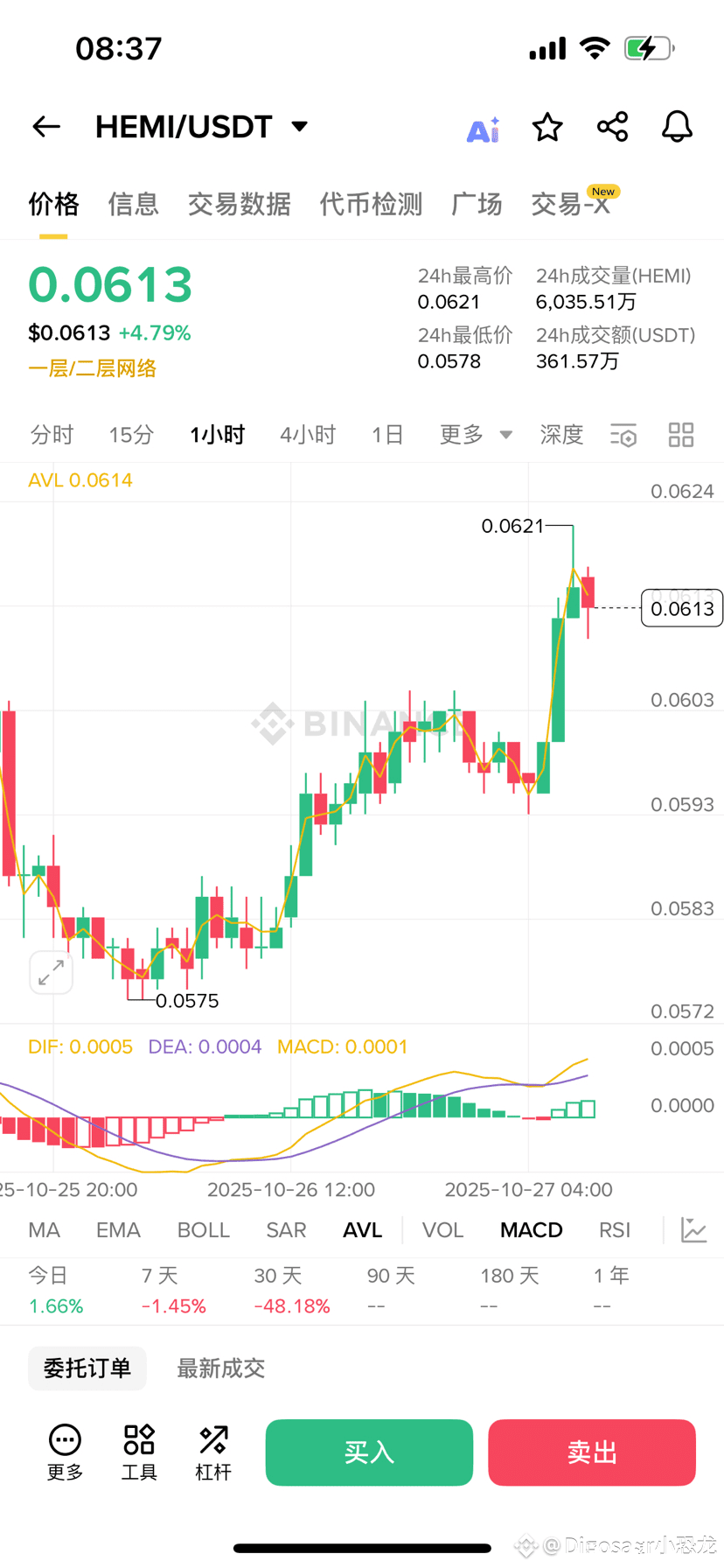 结论:HEMI当前正处于技术面与基本面双重驱动的上升通道,建议投资者重点关注其生态进展与链上数据变化。若后续能维持在0.062上方并伴随持续放量,则有望开启新一轮主升行情。但需警惕大盘系统性风险带来的回调压力,合理控制仓位杠杆。$HEMI
