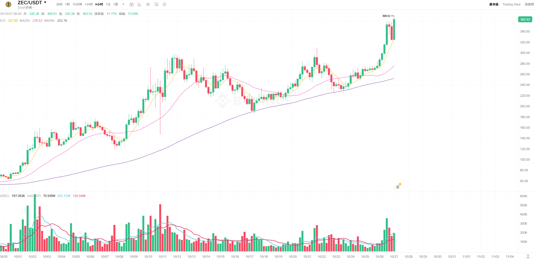 #zec 上週漲 30%,延續 10 月的強勢。雖然中旬小回調 10%,但現在價格已經反彈到 360美元。只要守住 280-290美元支撐,多頭勢頭就還在,牛市的節奏還沒結束!