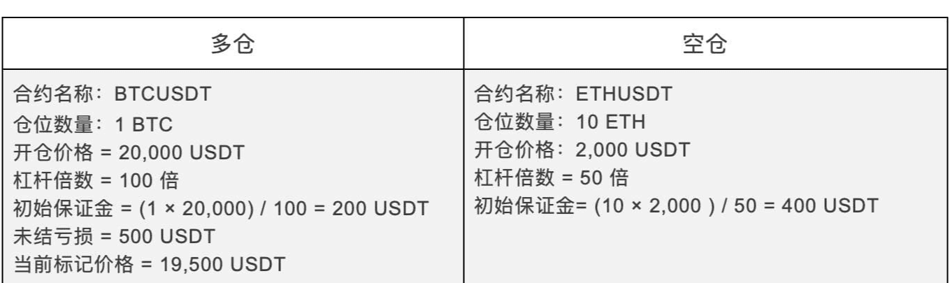 假設一張BTC正向合約面值爲0.01 BTC,用戶A在幣價20,000 USDT的時候買入了10張合約做多,20倍槓桿,如果不追加保證金,則(開倉價:20,000 USDT-強平價)*倉位數量(0.01 BTC*10張)> 初始保證金(100 USDT)