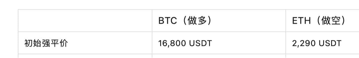 對於 BTCUSDT 倉位,(當前標記價格:19,500 USDT-強平價)*倉位數量(1 BTC)=可用餘額(2,500 USDT) + 初始保證金(200 USDT)所以BTC倉位的強平價=16,800 USDT