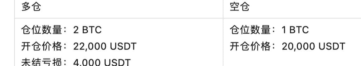 對於多倉,在計算強平價格時只需要考慮倉位的淨風險敞口:abs(多倉 - 空倉) = abs(2 BTC - 1 BTC) = 1 BTC。