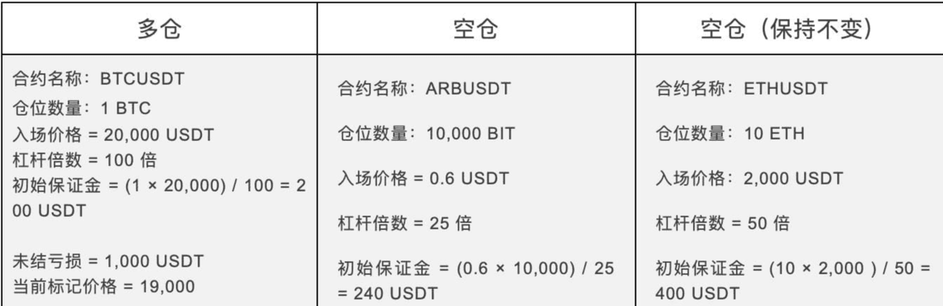 對於 BTCUSDT 多倉,(當前標記價格:19,000 USDT-強平價)*倉位數量(1 BTC)=可用餘額(1,760USDT) + 初始保證金(200 USDT)所以BTC倉位的強平價=17,040 USDT