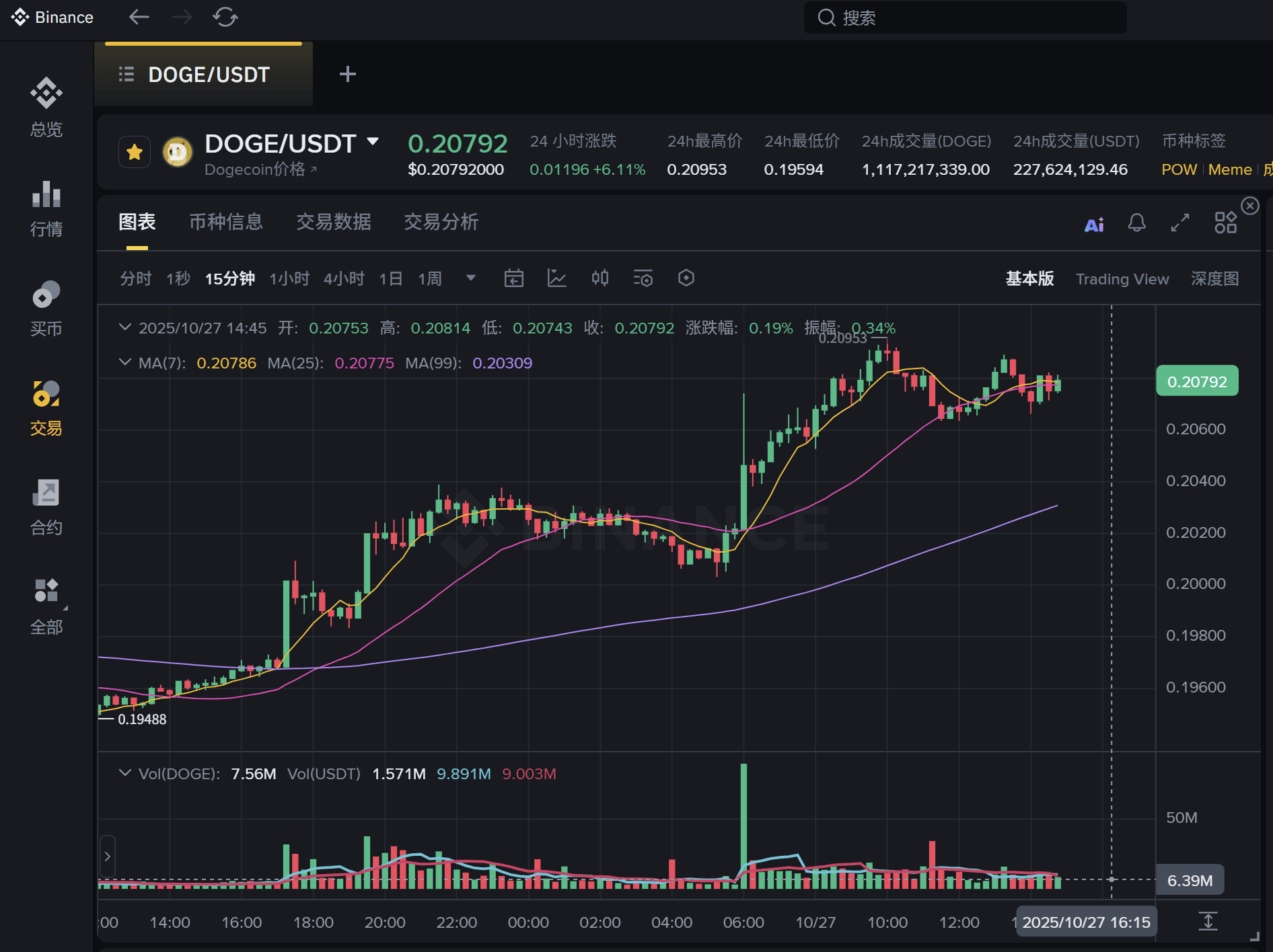 兄弟們注意了!DOGE今天突然就暴漲了6%,直接衝到0.2078美元!這走勢就像我家的柴犬看到零食,嗷一聲就撲過來了!MA(7)站在0.20785,MA(25)掛在0.20774,MA(99)趴在0.20309——三條均線粘合得緊緊的,這是要爆發的節奏啊!