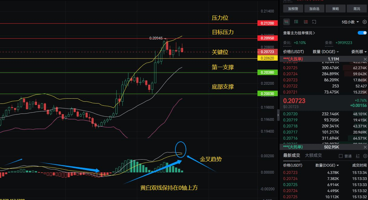 現在DOGE卡在0.20723刀,小漲0.76%,看着像要往上衝。重點看倆信號: