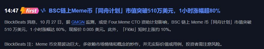 最近Meme幣圈跟炸了鍋似的!下午刷到條消息,BSC鏈上那“同舟計劃”1小時直接躥了80%,市值破510萬刀,現在還掛在0.005刀上蹦躂。Floki也沒閒着,跟漲10%。這幫資金跟聞着血腥味的鯊魚似的,全往Meme幣堆裏扎!