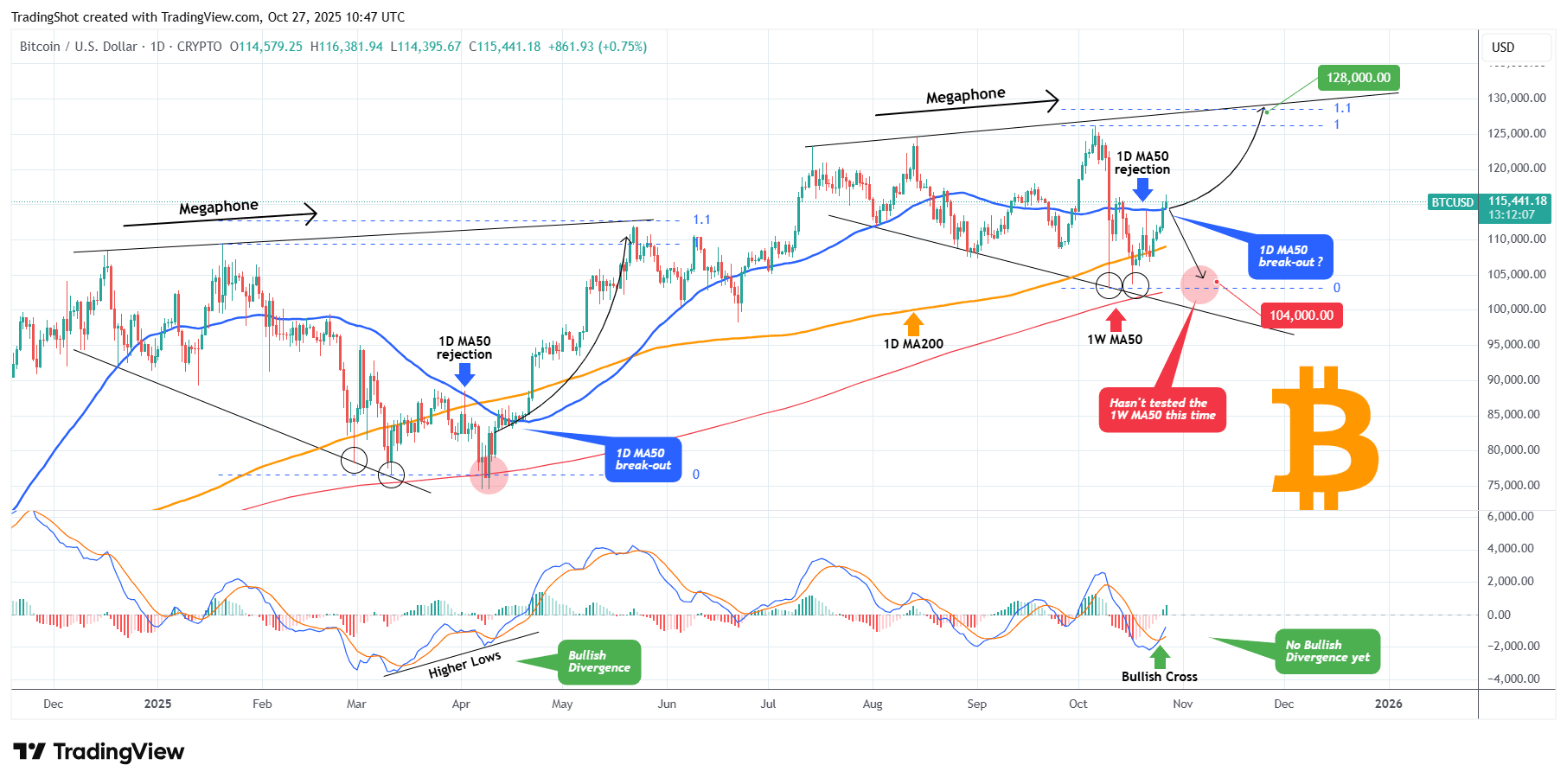 因此,目前兩種情況均開放。在它收盤高於 1D MA50 之前,1W MA50 測試仍然可能在 $104000 附近。然而,高於 1D MA50 的收盤加強了 $128000 處 1.1 斐波那契擴展反彈的概率。