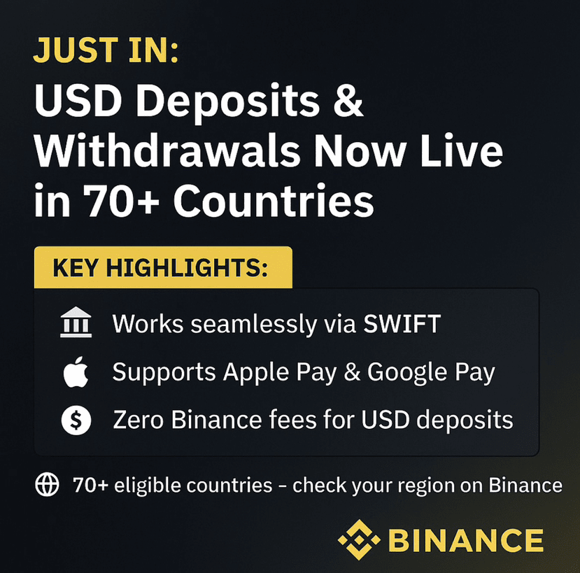 💸 USD 存款零 Binance 手續費(可能會收取當地銀行手續費)