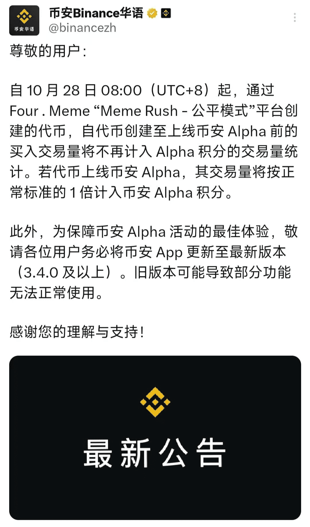 昨天幣安正式公告,Four Meme平臺的代幣早期買入量不算積分了,就算上了Alpha板塊也只按1倍算。這事兒真的太關鍵了,之前多少工作室靠這個鑽漏洞?用腳本刷Meme幣交易量,零成本堆出上千積分,普通玩家刷到手指酸都趕不上,活生生把空投變成了“工作室福利”。
