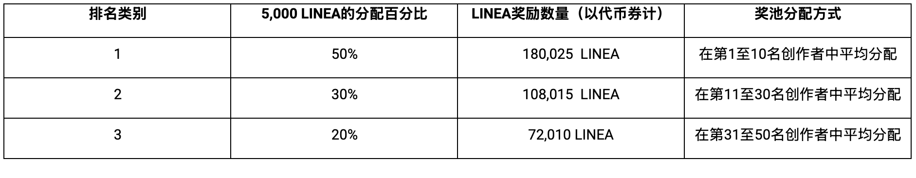 前50名創作者將有資格瓜分額外的360,050 LINEA獎池。此獎勵基於活動開始當天,7天廣場排行榜排名。360,050 LINEA獎勵將按以下表格分成三個排名類別分配: