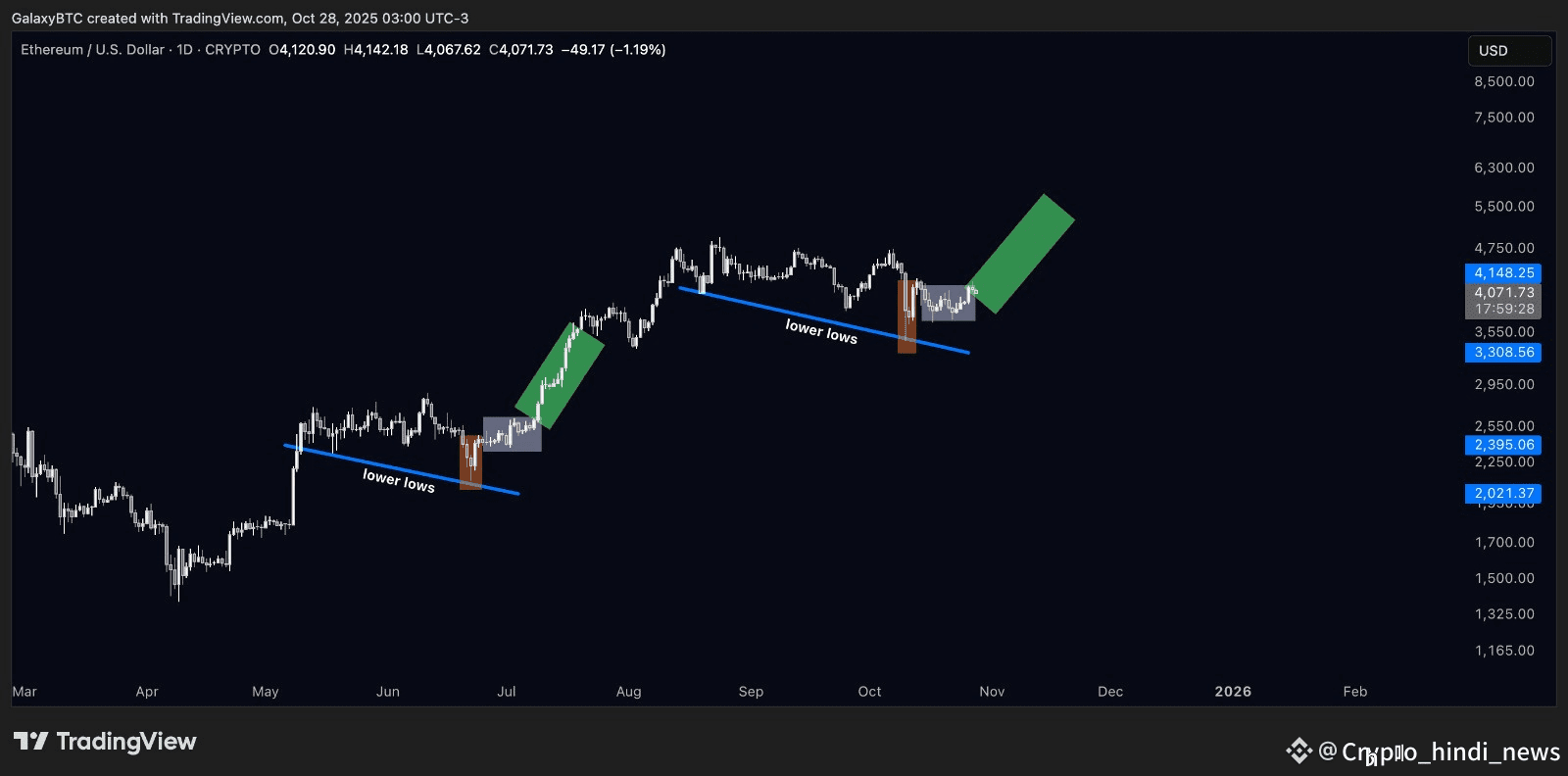 दूसरे एनालिस्ट Galaxy का कहना है कि ETH का मौजूदा चार्ट जून-जुलाई 2025 के पैटर्न जैसा ही लग रहा है - जहां लगातार लोअर लो बनते रहे और फिर अचानक एक बुलिश ब्रेकआउट हुआ।