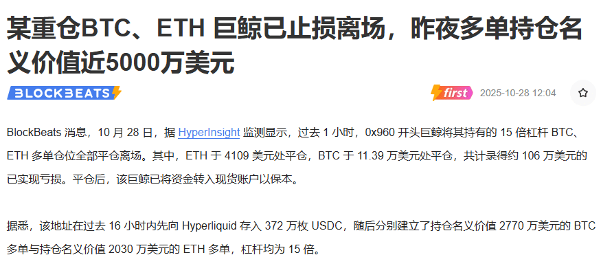 今天最引人注目的是一位重倉BTC、ETH的巨鯨,其持有的15倍槓桿多單倉位已全部平倉離場。