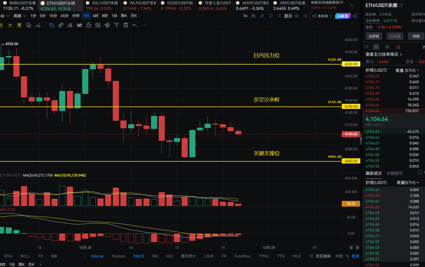 ETH在經歷一波下幅度反彈後在4100-4130區間震盪。我個人觀點很明確:今晚大概率還要再次向下測試支撐,甚至可能跌破。