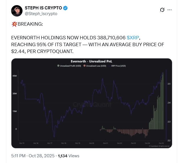 Evernorth Holdings approaches completion of its $XRP accumulation strategy, with unrealized profits climbing as the token rebounds above $ 2.55.