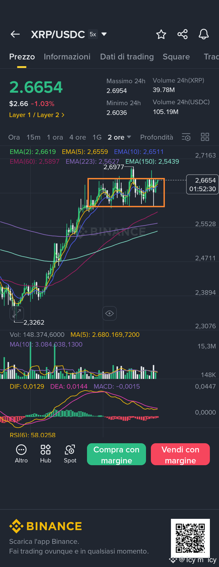 il prezzo ha deciso di lateralizzare (nel analisi precedente vi spiegavo la divergenza ribassista del macd, che ci diceva che avrebbe o lateralizzato o avuto una correzione), la fascia di prezzo della lateralizzazione è tra i 2.60 e i 2.67 in genere quando i prezzi entrano in questi periodi laterali, in cui il prezzo sembra muoversi dentro una scatola (arancione nel grafico) c' è una leggera probabilità(60%) che il prezzo tenda ad uscirne seguendo lo stesso verso in cui ci è entrato..