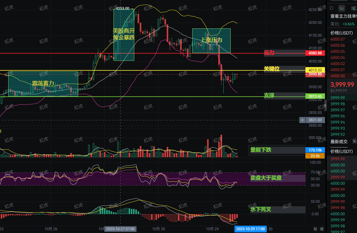 1小時圖上,ETH在4015下方縮量震盪,但虹虎發現致命細節:MACD水下金叉暗涌,布林帶擠壓至三月極值,多空持倉比突破臨界點!