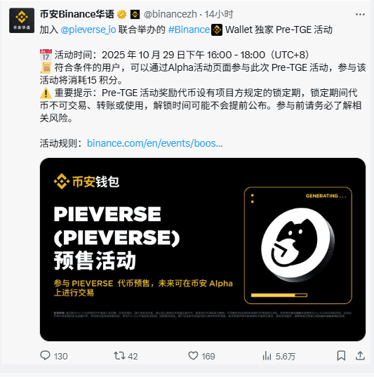 幣安 Wallet 聯合 @pieverse_io 搞了個 Pre-TGE 預售活動,