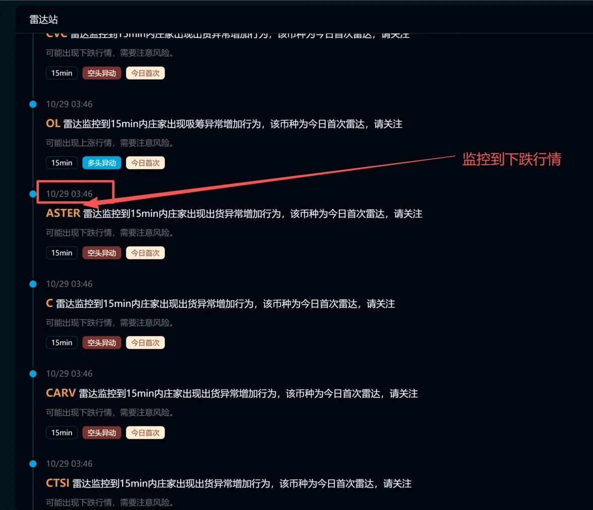 兄弟們,昨天我那篇"BitMEX上50倍槓桿,莊家要搞大事"的帖子還記得吧?今天凌晨3點左右,雷達站監測到ASTER出現莊家出貨異常增加信號,15分鐘內檢測到可能出現下跌行情。