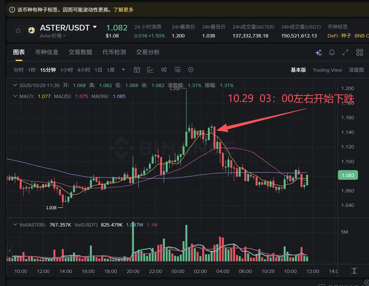 結果呢?你們看圖一——10月29日凌晨3點左右,ASTER從1.14美元附近開始跳水,現在已經跌到1.082美元了!