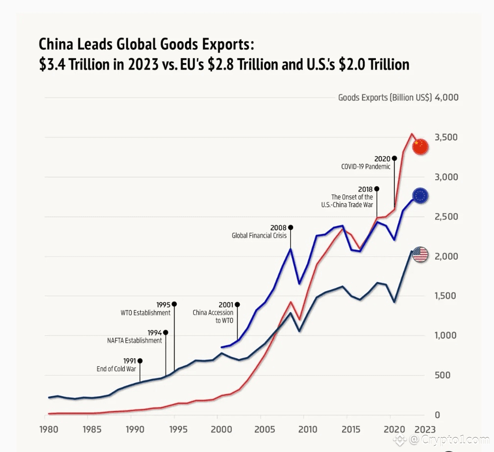 From 2000 to 2023, China's goods exports soared from $0.25 trillion to $3.38 trillion, marking an exceptional compound annual growth rate (CAGR) of 12.0%. In comparison, the European Union's exports rose from $0.86 trillion to $2.76 trillion, growing at a CAGR of 5.2%, while U.S. goods exports increased from $0.78 trillion to $2.02 trillion, reflecting a CAGR of 4.2%. This rapid expansion solidified China as the world's largest goods exporter.