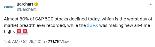 美國股市達到了歷史性里程碑,標準普爾500指數首次突破6,900點。然而,在這一紀錄的表面之下,隱藏着一個令人不安的事實——幾乎80%的上市股票在同一天下跌。這標誌着華爾街有史以來最弱的寬度反彈之一。