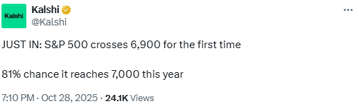 儘管有紅旗,但樂觀情緒依然高漲。預測平台Kalshi估計S&P 500在年底前達到7,000點的機率為80%。投資者押注於過剩的流動性、較低的利率和政治穩定,以維持牛市。