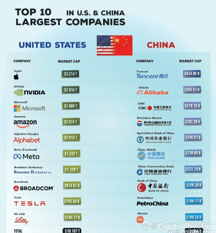 RankU.S. CompanyMarket CapChina CompanyMarket Cap1Apple$3.214TTencent$634.8B2Nvidia$2.916TAlibaba$350.5B3Microsoft$2.889TICBC$319.1B4Amazon$2.074TKweichow Moutai$282.3B5Alphabet (Google)$2.015TAgricultural Bank of China$246.0B6Meta (Facebook)$1.532TChina Mobile$238.9B7Berkshire Hathaway$1.128TChina Construction Bank$222.7B8Broadcom$914.5BBank of China$206.4B9Tesla$765.6BPetroChina$196.2B10Eli Lilly$740.8BXiaomi$180.3BTotal$18.187T$3.094T