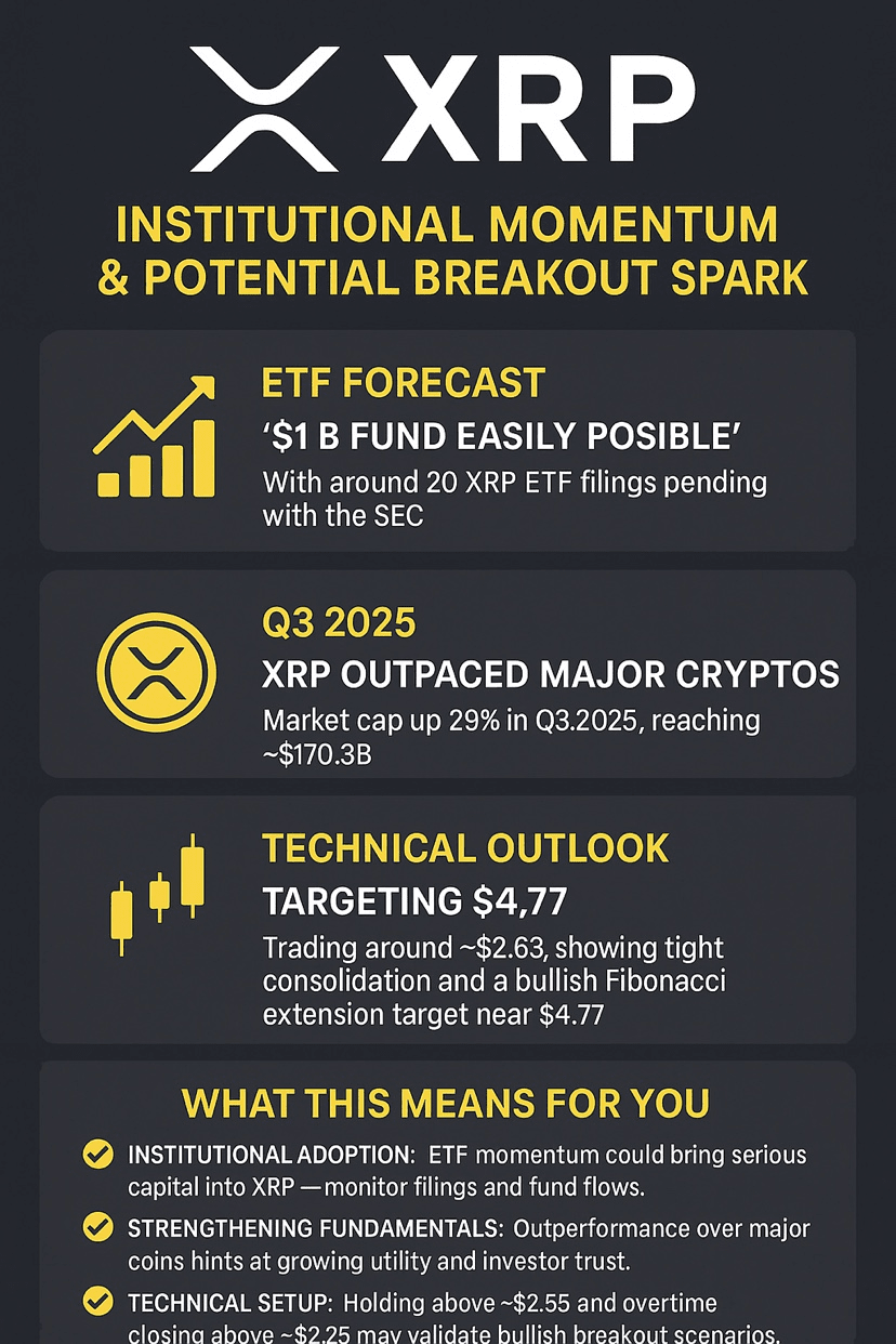技術分析師指出XRP的突破設置——交易價格約爲 ~$2.63,顯示出緊密的整合和接近 $4.77 的看漲斐波那契擴展目標。阻力位約爲 ~$2.75;如果幹淨收盤在此之上,可能觸發下一輪上漲。