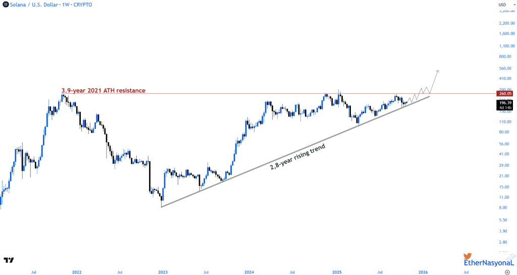Solana (SOL) 正經歷其價格動態的關鍵階段:分析師預測可能漲至260美元及以上。這種加密貨幣正處於重要阻力位與其2021年曆史高點(ATH)之間,同時也處於持續近三年的上升趨勢中。