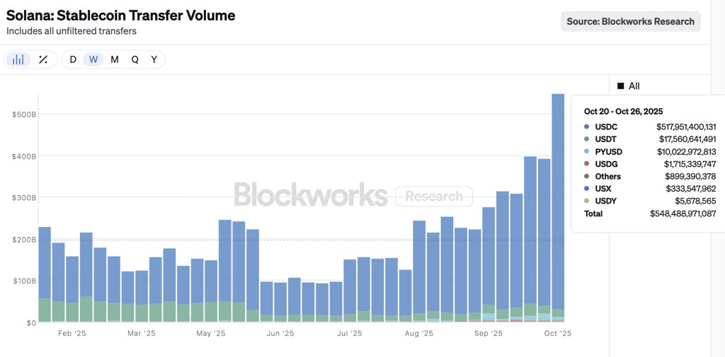 Solana在穩定幣領域繼續展示出令人印象深刻的增長。本週,網絡中的穩定幣交易量達到了5480億美元的歷史最高點。穩定幣交易數量的增長強調了Solana在去中心化金融(DeFi)生態系統中日益重要的角色。