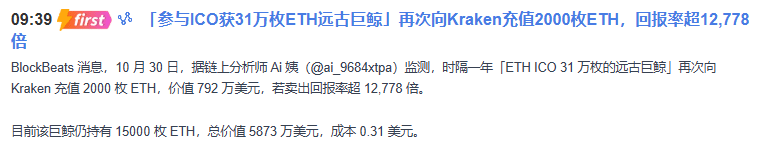 剛纔刷快訊,一位持倉31萬枚ETH的遠古巨鯨,剛剛向交易所砸了2000個ETH,價值792萬美金!