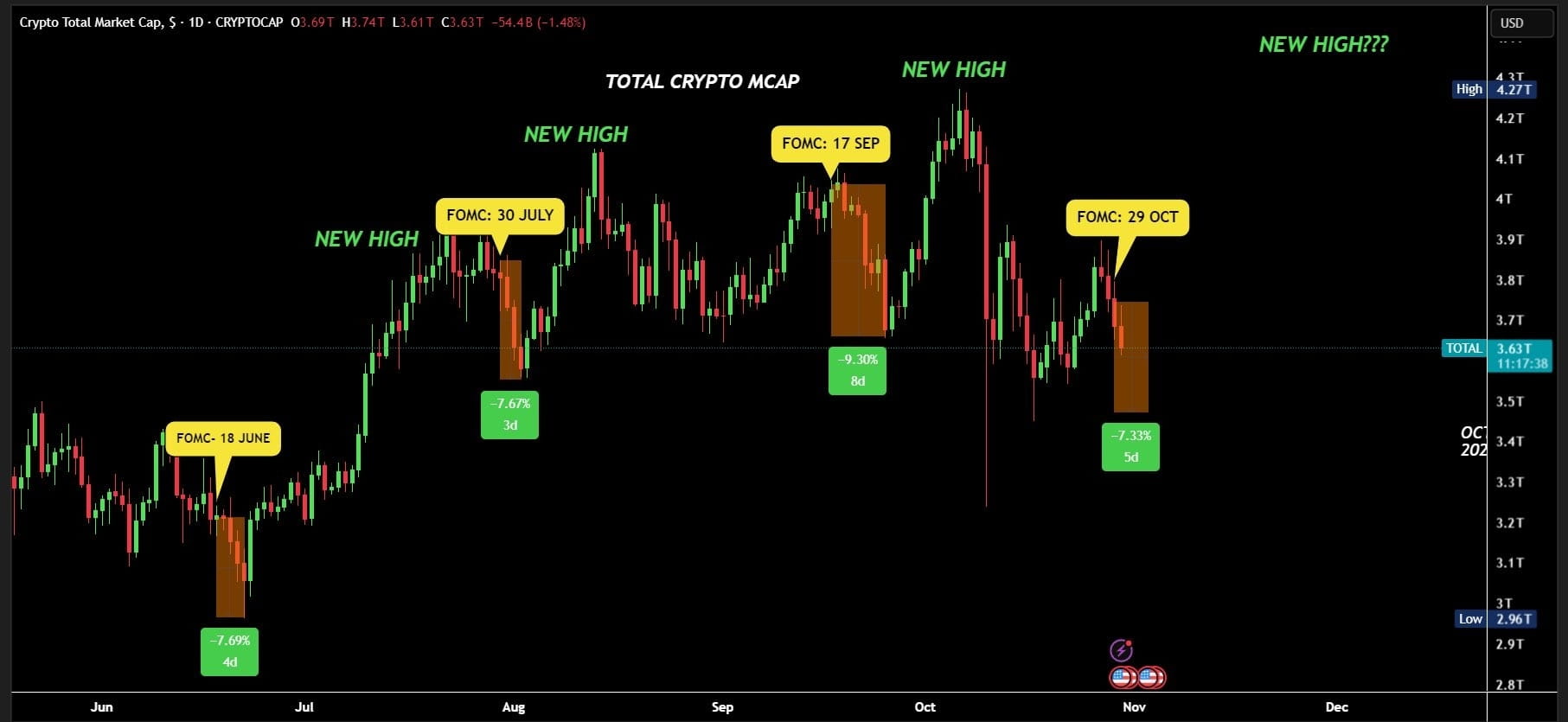 看看數據。在每次FOMC會議後——6月18日、7月30日、9月17日、10月29日——總的加密市場市值在接下來的4-8天內下降7-9%。就像時鐘一樣。然後,就像可預測的一樣,它回升到新的歷史高點。