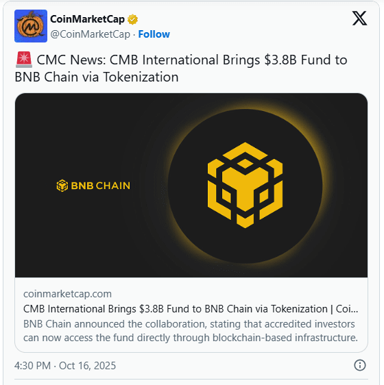 #CMB 國際將38億美元的貨幣市場基金在BNB鏈上進行代幣化:招商銀行(中國招商銀行)通過CMBMINT/CMBIMINT代幣將其旗艦美元MMF上鏈,由DigiFT分發——這是BNB鏈機構軌道的一個重大現實資產里程碑。