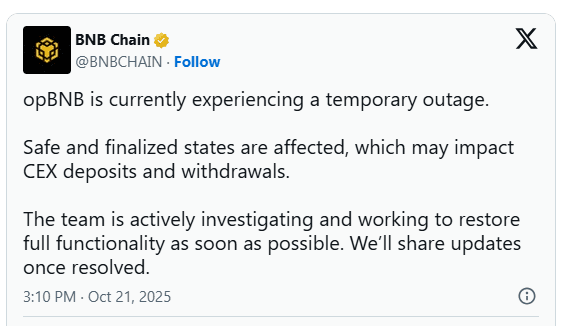 #opbnb 經歷了短暫的停機:BNB鏈報告了一次影響安全/已確認狀態和某些CEX流的短暫opBNB停機;在減輕後,操作隨後恢復。