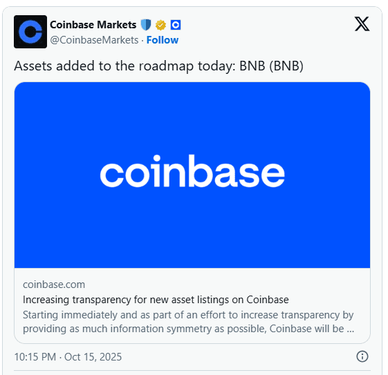 #coinbase 將BNB添加到其資產清單路線圖:Coinbase Markets宣布BNB已被添加到其路線圖中,增加了對潛在未來上市的透明度(不保證)。此舉擴大了BNB在美國交易所的潛在曝光度和敘事範圍。